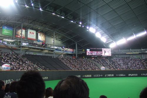 行って来ました札幌ドームへ。ファイターズの選手達に 活 を入れて来ましたよ?。その影響かどうかは定かではありませんが大勝でした。豪快に4本の 特大花火が打ち上げられました。稲葉 2発糸井・鶴岡が1発ずつ。私が応援に来ている事を知っていたんでしょうな。(ナイナイ)祝砲でお祝いをしてくれましたよ。試合も去ることながら応援合戦が凄い!!!。リズムに乗って(合わせ)メガホンを叩き稲葉ジャンプあり大声張り上げての応援。ストレスがスット レス と飛んで行ってしまいましたよ。驚いたのは応援の仕方が観客一同が統一されていたこと。バラバラでは無かった事だ。選手一丸・観客一丸やるきになるわ。私が!。 アレ良かったなぁ。また 行くぞ。