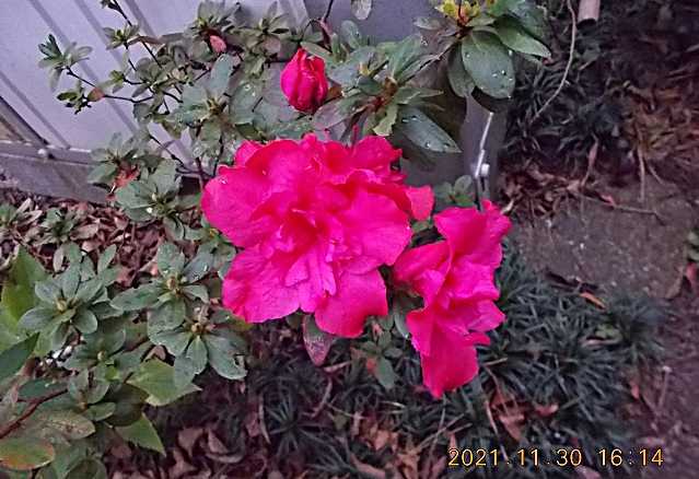 1614、ようやく外へ。ベランダ下のアザレア、秋冬と春に咲く優れもの