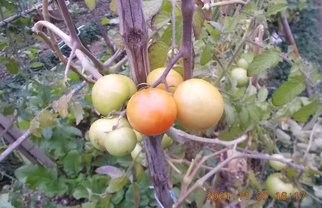 久し振りに菜園見回り。四囲を民家に囲まれたMy菜園、まだ初霜は来ていなかったのでトマト健在。かなり色づいていた。