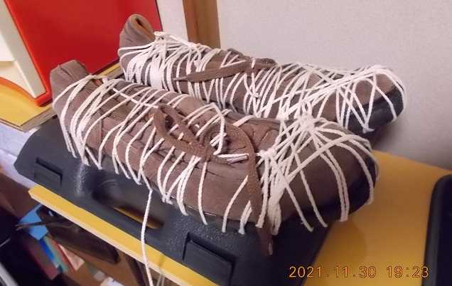 1923,底が剝がれたカジュアルシューズの接着、タコ糸でぐるぐる巻き