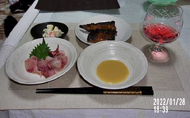 1839、二男会食、バンメシ、鯉洗い、サラ、ウナギ、ワイン