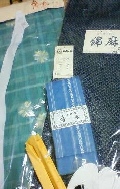 これこれらです。右が夫用浴衣、水色が綿角帯、下白いのは足袋、下黄色いのは着物ハンガー、左が私の浴衣、べろ~んと私の浴衣の上を走る白いモノは浴衣附属品の衿芯(発砲スチロールっぽいもろそうなやつ)。共衿の裏っかわに入れろと書いてありますな。この浴衣と前に福袋で買った浴衣、両方共衿はトンネルになっていて、入口が縫われてないの。手抜きかと思っていたけど、ワザと縫ってない?でも表は縫って欲しいような?えとえと、前回浴衣買ったばっかりで、なんで買ったかというと。夫の浴衣10円開始を見つけて、なんちゃって入札したら、そのまま競合者がいなくて10円で落札しちゃったんですよね 。だもんで、夫に「浴衣10円+送料650円で買っちゃったから花火大会には着てよね!!」と強要して、同じ店で角帯も追加で買うハメに。こっちは定価。で、送料もどうせ払うことは決定してるんだから、と私用の浴衣にも入札。普段送料を考えて入札しない値段になっても、どうせ送料払うんだからとちょっと高めに入札したら落札出来た。お店の思うつぼか~ だがしかし、全部で3,000円いってませんので、良しとするぞ、うんうん。と自分を納得させる。・・・そのそばから夫が「ちりもつもればなんとやら~♪ウシシ」と私の良心をチクチク刺すけど気にしないもんねっ!以下、自分を納得させる為に、必死こいて楽天で見つけた同じ(シリーズ)と思われる商品。男物綿麻浴衣-No.111(地色・紺色・変わり織り生地)綿100% 博多織風 角帯 水色 新品変わり織り浴衣-No.146(粋と粋)ターコイズブルーこの浴衣フリーサイズで裄67cmなので、5cmほど足りないんですけどね。身丈も短いんで、おはしょりどれくらいとれるかなぁ?って感じなんですけどねっ。まっ。夏だしっ。浴衣だからっ。ねっ。