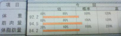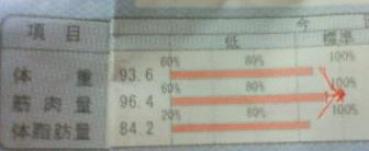 3ヶ月後の目標は「目標は3ヶ月後に今より筋肉量が増えていること!」だったのですが、筋肉量は変わらず、脂肪がちょっと減りました。これくらいは普通に変動するんだろうな~とがっかりです。しか~し、測ってくれたジムの方は、お正月太りしてないから優秀ですよ~!と褒めて下さいました。 この~、商売上手♪♪ 嬉しくなってまた通おうっと、と思った単純なワタクシ。計測したもの↓赤ボールペンはこの">"型になってるのは良いですよ!筋肉量を100%に持ってこられたらもっと良いですよ!と褒めてくれた跡(笑)手・腕の筋肉をつける運動をするようりも、まず体幹に筋肉をつけた方が良いかも と言われたの図。入会してから、会費払ってるんだから行かなくっちゃ!と一応月に3回は行ってます。月4回会員なんですけど(笑)なるべく4回行くようにがんばるぞ~。でも今月もまだ3回しか行ってません(汗しかもボディーコンバットは楽しいけど辛い~と40分の自転車こぎに変更してしまった。辛すぎて行かなくなるよりマシだよね、と自分を騙しているけれど…そのうちちゃんとコンバットに戻らなくてはー。