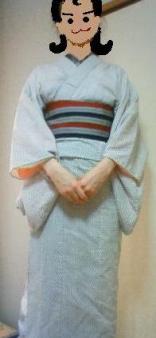 こんな感じ。洗濯&アイロン前だから、しわしわです~てへ☆ミ下に着ているのはこの前に完成した正絹襦袢(ピンク)。長着が薄いので下のピンクが透けるのだが…このまま外に出るのは拙いのか? 夏の襦袢じゃないし…? 染織こだまさんのブログを読むと、昔はなんでもありだったようだし、この長着も綿麻化繊混のおもいっきり普段着だから、ジーパンOKな場所の外出ならいっか。☆長着反省点のうち大きなモノ(ほかは忘れちゃった)反物が表裏なさそうだったので、標つけは両面チャコペーパーでつけた(モスリンの時の切りしつけよりは楽!でも正絹をへらでつけるのが一番楽だった)→きせをかけるのにアイロンがけ→洗ってみたが一部チャコがとれない箇所あり (畳んだまま洗濯したので、よく洗えていない?)。キングサイズの反物でも11.7CMでは足りない→かぎ衽断ちじゃなく三つ衿断ちという裁ち方で裁った→衿の幅がたりなーい →バチ衿だけど、衿先に向かって広くなっていない☆良かったこと肩当て・居敷あてをつけた→肩当てにした晒しが反物より幅が狭く、どうなるかと思ったけどなんとなくOKな状態になった→居敷あてを大きめにとったせいか着ても居敷あてが目立たない気がする。反物の端に汚れがあったので、耳ぐけでOKなとこも折りぐけにして隠した。裄が襦袢とあってる!(エクセレント)☆わからないこと未だに袖と身頃をつけるときのまち針の打ち方がわからない。0.5cmどこにどうするんだよっとイライラする。その他色々…上前の衿先って、着た後はおはしょりの中に隠れるのが普通?? 着たときにおはしょりの下に衿先が出ているのが気になる。これが普通?もう一寸衿下(褄下)を長くして作った方がいいのか~?マイサイズ、検討し直しです・・・参考→ 長着の部位名称 妹に「落武者」画像として送ったけど、ウケなかった↓