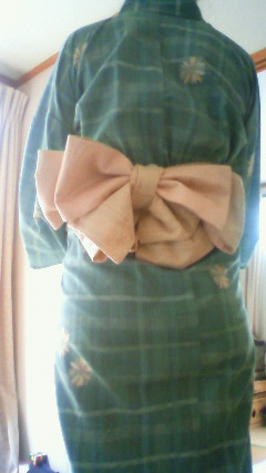 久しぶりに自宅で浴衣を着て過ごしました!暑さも収まったし、コレくらいなら快適かな?と思いつつ。でも着るのが面倒なので素肌に浴衣 伊達締めもしょうりゃーく! 外に出ないんだから何でもアリです 笑帯は以前すべるー!もう外には着て行かないっと決意した初めて作ったファブリック帯もどき。なんせ半幅で縫ってありますから くす。ファブリック帯の本のとおりに帯を締めたら案外ほどけて来ませんでした。すごい。半襦袢も伊達締めも省略したのに結構汗が出たので、明日にでも洗濯します。浴衣はこれで着収めかな~着付けのしわしわとケツのでかさには目をつぶってください・・・>w<これってもしかしてグロ画像!?Mサイズ浴衣は身幅はOKで裄も夏だし短くてもOKなんだけど着丈がやっぱり足りなくっておはしょりがみじか~いです。この写真ではほとんどおはしょりないですな 苦笑腰紐を出来るだけ下にしているんですが、やっぱり短いっす。そしてそして身八つ口が小さいせい(?)かコーリンベルトが上がってきて、脇や帯の上の方に見えちゃうんですよぉ~ ナゼダ。