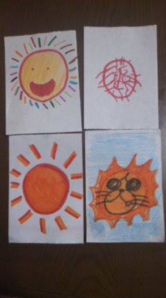 とんねるずのノリタケさんこと、木梨憲武さんがブログで「タテ10センチ、ヨコ7センチの紙に自分の太陽を書いておくってみて! 何か作るから」と、太陽の絵を募集しています。締め切りは4月30日。という事で、昨夜家族みんなで心をこめて、太陽の絵を描きました。上は、子供。特に右上は、太陽っぽく無いですが、2歳の娘が一生懸命「おひさま~」と言って書きました。旦那のは、ライオンに見えなくもないですが。太陽を書いたら、少し心が温かくなりました。みなさんもかきませんか?