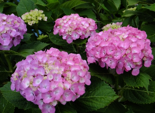 ☆庭のアジサイが咲き始めました。 ☆家では青色の花が多いんだけど、まだ色がついていなくて、今はピンク色だけです。 ☆ガクアジサイは1輪だけ青色になってきました。これからどんどん賑やかになります。今年はどの花もよく咲いていますが、アジサイもここ数年で一番つぼみが多いようで嬉しいです。素敵な名前がついた珍しい品種などはひとつもありませんが大きな花がたくさん咲いてきれいです。咲きそろいましたらまた。
