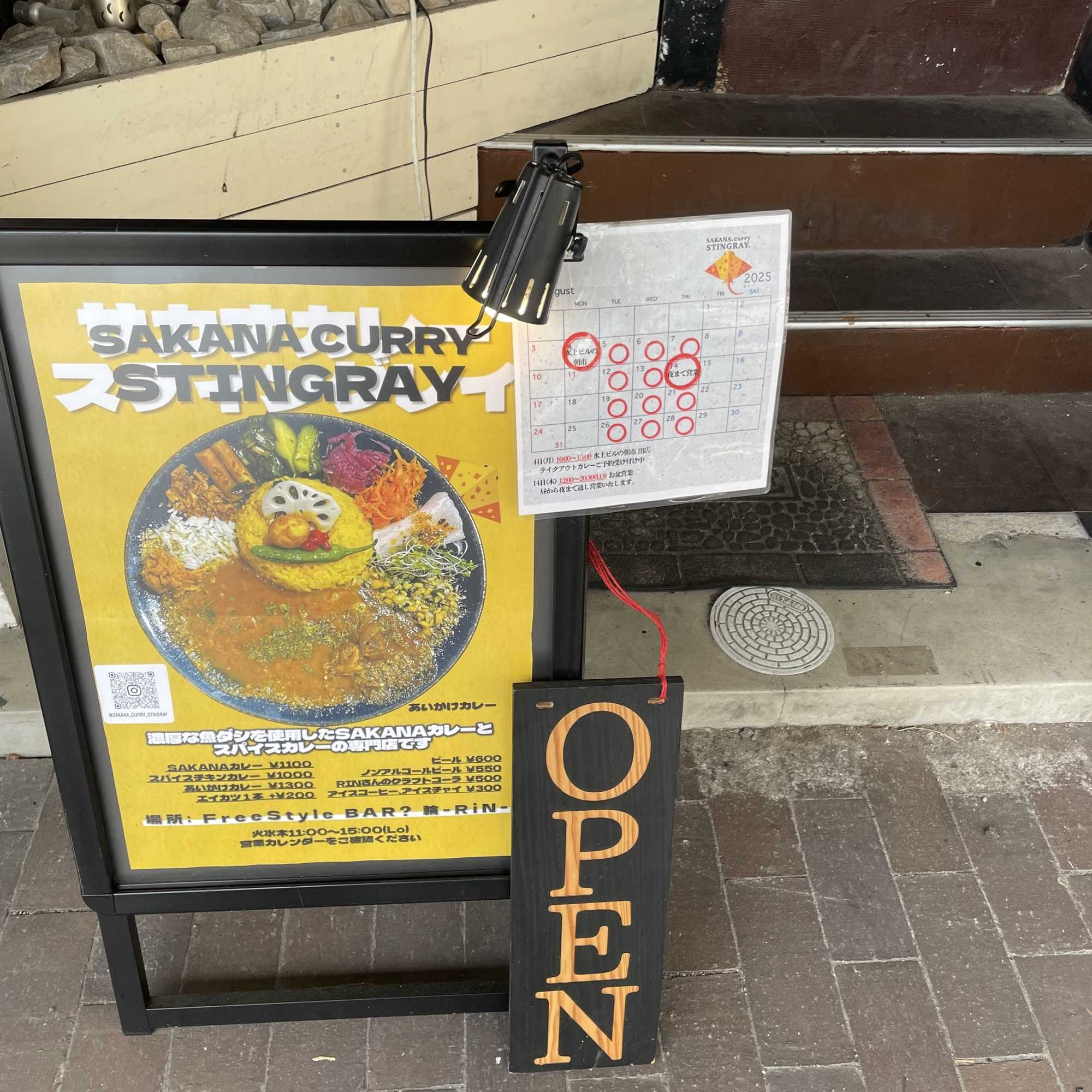 豊橋市にあるお店です。元々はバーのお店で、平日のお昼のみスパイスカレーをやれているそうです。インスタのDMで予約して伺いました。階段を上がり2階にお店はあります。カウンター席にテーブル席が少し。さすがバーだけあっていい雰囲気。純粋に夜お酒を飲みに来たくなる(笑)カレーは2種類。SAKANAとスパイス。両方味わえるあいがけもありそちらも注文。されに限定のグリーンカレーにトッピングでエイカツも。少し待つと登場。圧巻のビジュアル、ボリューム感!副菜は10種類も。そんなにガツンと魚出汁という感じはしませんでしたが、やさしい味わい。副菜もいろいろあって楽しめますね。美味しかったです。ごちそうさまでした。