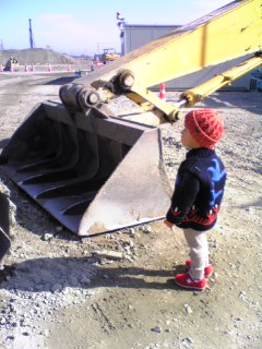 またまた工事現場に行ってきたよん。 いっくん大きいって興奮してました。 ブルトーザを見て今日はハシャイデたけど、地面がゆるくて歩きずらかったよ。 ブーツも汚されて〔ムカ〕 けど、喜んでる姿には敵わないわぁ。