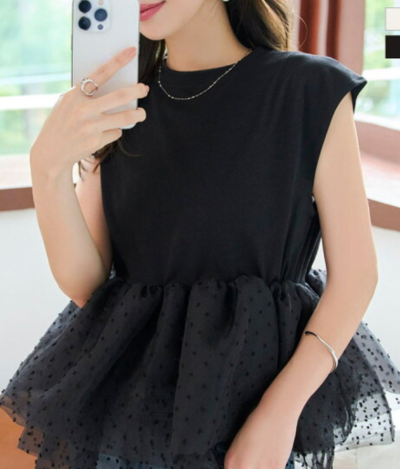 商品詳細はこちらへ←私の楽天ROOM🔹#カットソー🔹▶たっぷりのフレンチスリーブが目を惹く、 華やかさ満点のドッキングTシャツ♫#yusukeレディースファッション ↑レディースファッションコレクション≪8/21 新発売!!3280円 送料無料≫ フリル ドッキング カットソー [C7623] レディース 20代 30代 40代 夏 トップス Tシャツ フレンチスリーブ ノースリーブ クルーネック オーガンジー チュール フレア シアー 透け感 異素材切り替え ドット柄 ドット 大人可愛い【送料無料】ショップ#神戸レタス(KOBELETTUCE)#おうちスタイル #スポーツミックス #2025春夏 #韓国ファッション