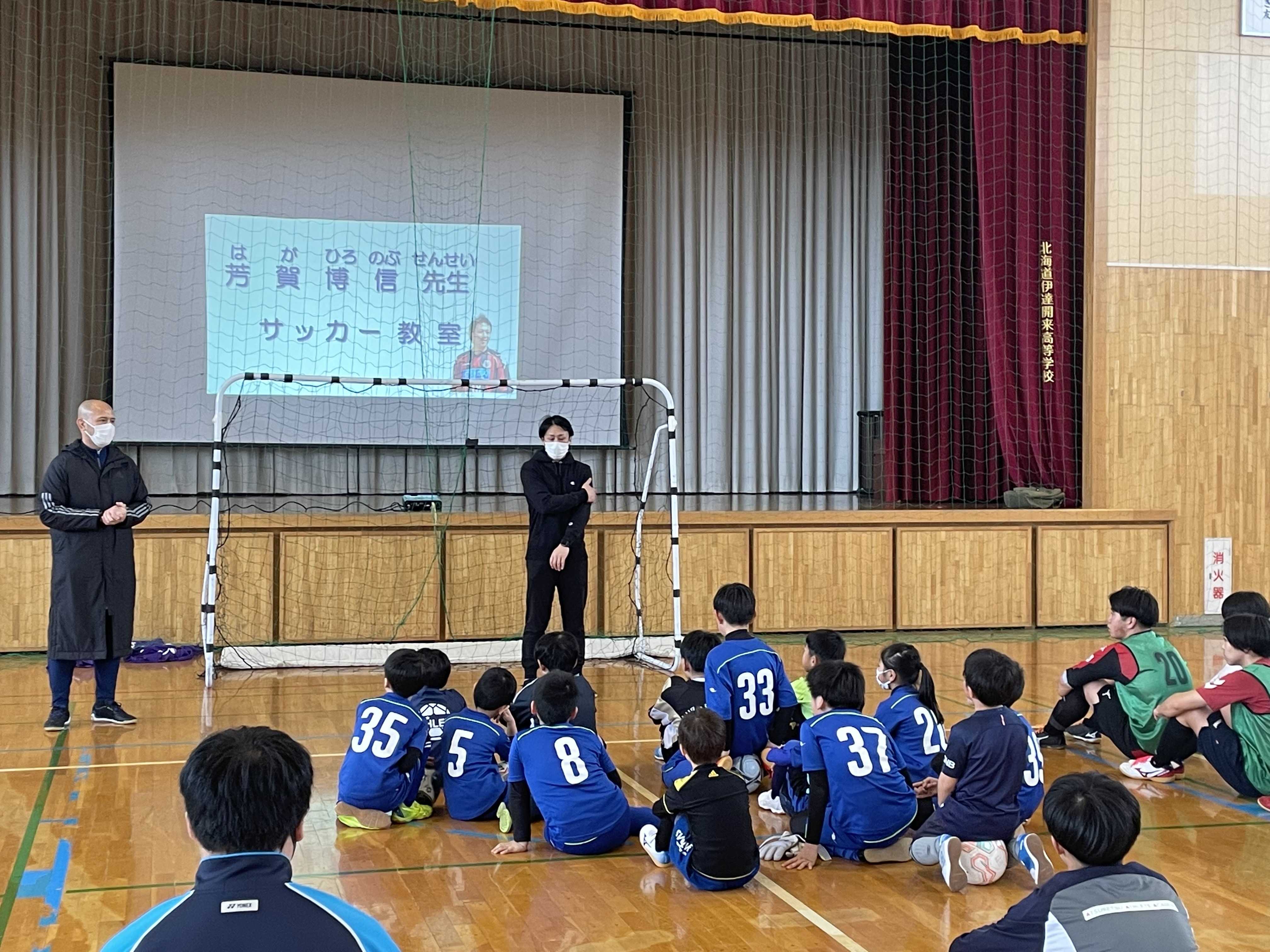 伊逹開来高等学校体育館で、サッカー教室が