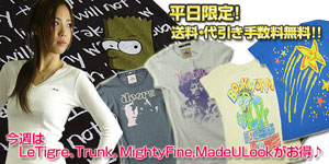 皆さん、今日もお疲れ様です。Happy October☆今週は何がお得!?平日限定!送料・代引き手数料無料キャンペーン☆今週はなんと4ブランドを一気に無料にしちゃいます!!! お手頃プライスで着心地抜群の【ルティグレ】クレヨン画みたいなイラストで大人気!【メイドユールック】おちゃめなプリントが超!キューティー☆【マイティファイン】一味違うTシャツが欲しいなら!エッジーなデザインの【トランク】 本日2007年10月15日(月)~2007年10月19日(金)23:59まで対象ブランドを単品で購入されたお客様、対象ブランドと対象外ブランドをまとめて購入していただいたお客様が対象です。お得な平日限定企画、是非チェックしてみて下さいね☆