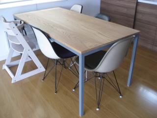 前にも 『食器デビュー』編で写ってましたが満足度No.1のダイニングテーブルです165cmでオーダーしました 全体写すと脚の色がうまく出ないので こちらの色の方が現物に近いです お気に入りポイントの脚先です天板と同じ木が使われてます。 送料25000円位と言われて(本当に北海道は送料が難です)迷ったけど夫くんのgoで購入 階段もソファーもグレーなので このテーブルも候補でした