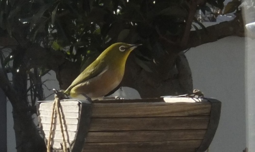 ある冬の日 小鳥たちがベランダの餌箱のところで この家のご主人が 輪切りにしたみかんをを啄んでいました。そこに 音もたてずに のっそりと野良猫がベランダにあがってきました。すると小鳥の一羽が「みんな注意していつもの猫がきたわ、食べられないようにしましょう」と 飛んで行ってしまいました。猫はその声に「何だお前たち、オレは小さい時からここに来ているんだ。お前たちは冬の間だだけじゃないか、オレはここのご主人と仲良しなんだ、時々美味しい餌も貰えるんだぞ、お前たちを食べなくても生きていられるのさ」と紫色の綺麗な花の前でゴロンと寝そべりました。それを花梨の小枝で聞いていた一羽の小鳥が「なーんだあの猫は私たちを食べたりしないんだわ」「いつも光った目でじっと見ているから怖いと思っていたの」すると、もう一羽の小鳥が、「そうね この間 ここのご主人があの猫と話ているのを聞いたわ、「あんた小鳥を狙っちゃだめよ、だいたいあんたに小鳥を捕まえることなんて出来ないよって、あの猫ご主人の言葉がわかるのかしら」それを聞いていたうたた寝の猫は薄目を開けて「もちろんさ、オレは人の言葉がわかるさ、だから、お前たちを捕まえていないだろ、だけど、こんなに気持ちの良い昼寝の時間を邪魔したら、いつか飛びかかるぞ」と言いました。その話を窓越しに聞いていた ここのご主人が「まぁまぁ小鳥さんも野良ちゃんも仲良くしなさい、どちらも私の大切なお友達なんだから、それに小鳥さんは、もうすぐ春が来ればお山に帰っていくんでしょ」と言いました。その言葉に小鳥はちょっと寂しそうにチッチッッチとさえずり野良猫も大きなあくびをしながら満足そうにニャオ~ンと鳴きご主人は、温かい春 早く来ないかなぁ~~て言いながら部屋に入って行きました。