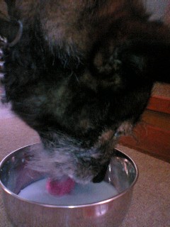 今日も雨だね。雨降りも嫌いではないママだけれど、今日はちょっと違うの。気分は雨降り。 それはね、ジイジがなるべくしてなったと言うか・・・ 高熱を出して唸っているの。 実は先週バアバがひどい熱を出してね、もちろんその看病をジイジとママとでしたのだけれど・・・慣れていない(ママだって慣れていないけれど)ジイジは心底かいがいしく看病をしていたんだわ。そうじゃなくたって、バアバのしびれた手をさすり続けてるって言うじゃない、くたびれてバアバの熱がうつっても不思議はないよね。 バアバは風邪だったらしいので、病院が閉まった後で(昨日の晩)発熱したジイジにはママの持っていた風邪薬を飲ましたよ。いざと言う時のためには座薬を薬局で買ってきたし・・・ 今日はパパは残業だし、明日は日曜日だし、ママは心細いんだ。薬を飲むと少しは熱も下がり楽になるのか、眠っているジイジ。その足元で丸くなって眠っているエマ。 忙しくって牛乳の賞味期限が今日だったよ。ロイヤルミルクティー用に買ったやつ。いつもはう○ちが硬くなったエマにニュウニュウを作ってやるんだけれど、今日もニュウニュウ日にしてしまおう。 ニュウニュウは牛乳のお湯割り。冷蔵庫でギンギンに冷えているまま与えるのはどうかと思ったし、牛乳のままだとカロリーが高いかなと思ってお湯割りにしてやるんだ。 エマは水だと少ししか飲まないけれど、ニュウニュウをやったらペロペロ飲みつくしてしまうよ。その効果も絶好調。愛にもやったよ。ハウスが隣のじゅうべえの鼻はクンクンと匂いっぱなし。じゅうべえにはまだニュウニュウをやったことないんだよね。 六ヶ月過ぎたしもう、いいかなぁ~(何の根拠?)で、めでたくじゅうべえもニュウニュウの味を知ってしまったよ。 魅惑の白い水とはニュウニュウ(牛乳のお湯割り)のこと。 もちろんじゅうべえも嫌いなわけが無くぜ~んぶ飲みつくしたよ。あぁ~~~おいちかったね。 <ママのひとこと>ママも喉がおかしいの。扁桃腺があるから気をつけないとね。