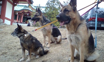 シェパと小さなワンコズの愉快なブログ「たちみみ倶楽部」のかおるさんから「大きい犬で集まって遊ぼう」って今朝メールをもらったよ。ちょうどパパがお休みで、ちょうど近く方面にお出かけの予定で、ちょうどママの用事も集合時間までにギリギリ済んで合流できるかな?これってもう行くしかないでしょ愛はヒート中、エマは中型犬?「ボクボクだよねボクいくよ」って、行く気マンマンのじゅうべえ。アンタのその興奮振りがママは不安だよ。 パーキングに着いてみると、シェパのピースちゃんと秋田犬のみやびちゃんが来ていたよ。はじめまして。お外でみんなで遊ぼう!みたいな会に我が家は初参加、ドキドキするよ。 向こうの方にみんな集まっているみたい。みんな・・・大型犬がいっぱいぃぃぃぃぃ~~~~~うれしい 場所を移動してとあるグランドへ。いよいよリードを外して遊んでらしゃい。走るぅ~、走るぅ~、おれぇ~たちぃ~(上の画像をポッチとしてね、動画が見れるよ)アイリシュウルフハウンド、ボルゾイ、グレートピレニーズ、サルーキー、ゴールデンレトリーバー、バーニーズ、G・シェパード、秋田犬、シェルティー、フレンチブルドッグなど。 じゅうべえは・・・と言えば、はじめのうちはノーリードと広いグランドが嬉しくって走り回っていたけれど、今日の午後はぽかぽか好い日和、すぐに喉が乾いてみんなの用意している水入れをはしご(スミマセン)。そのうち、お気に入りの子を見つけて追い掛け回す始末。行き過ぎ行為のイエローカードが出る前に捕獲。しばらく様子を見て、ノーリードにすると・・・今度はその子と同じ犬種の子のストーカー。ゴールデンレトリーバーにぞっこん。 ママ、「ほらほら、あっちでシェパ軍団が、かけっこをしてるよ。行っておいでよ。」じゅうべえ、「いやです、ボクあの子と遊びたいよぅ~。なのに、どうして逃げるのかな?ママァ~」ママ、「アンタがしつこいからだよ。」じゅうべえ、「しつこいって食べれる?」ママ、「だめだぁ~」 ひとしきり遊んだら、あちこちで記念写真を撮り始めたよ。ねぇ、シェパが5匹も寄ってるんだから・・・そうよねぇ~、並べて写真撮りたいよね。(じゅうべえ、すぐに動き出して足引っ張ったよ、ハズカシイ) <プチクイズ・・・じゅうべえはどの子?>商品はありません、あしからず。 ママもいろんなワンコさん方とのふれあいを楽しんだよ。ねぇじゅうべえ、めちゃ×2楽しかったね。 <ママのひとこと>みんな名刺交換をしてたよ。ママもうちの子達の作りたいなぁ~。ママにもできるのかなぁ~。