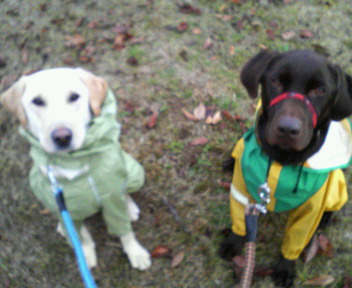 ダンナ&子どもは結婚式に出席で、今日は3人でお留守番♪お天気も悪いし、のーんびりしてます^^食事のことを考える必要もないし、こういうのも悪くないですね(笑)お天気が良ければ、3人でお出かけしたいところだけど、まったりまったりな一日。唯一の外出は、お散歩でした!私を含め、みんなカッパ着用。携帯カメラなので、かなりピンボケ^^;