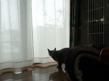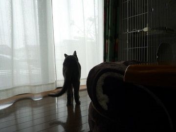 鳥さんが、窓の外の薔薇の樹に止まって、