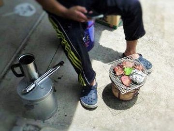 ガレージの中で、水槽に入れ酸素ブクブク。