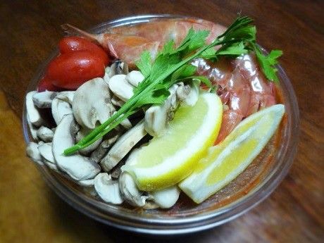 生海老4匹、ミニトマト、スライスされたマッシュルームと玉ねぎ、