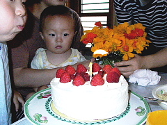 今日は僕の可愛いハニー稜くんの1歳の誕生日でした。色々な事があった1日でした。まずは兄ちゃんが久しぶりに幼稚園に行かないとおおぐずり、、、。でその後お店のメニューがいまいち上手く行かないのでパソコン用のメニューのソフトを買いに、、、これが売ってなくてあちこち探しに、、、そしたら稜くんが眠くなってしまいおおぐずり、、、。昼ご飯当番はもちろん僕でしたが3種類パスタを作ることになっていてあせったら、、、数年ぶりに指切りました(笑)。その後お店やアパートのアスファルト、コンクリートの補修の材料を買いに行く途中、、痩せてる中村俊輔似の男がチャリで横を通りましたら、、、シナくんじゃないか~。で、買って帰ってきて日曜大工?ここのところこんな事ばっかりで割と忙しいです。で帰ってきて誕生会。その時の模様は、、、 とまあ、こんな感じでした。飲んだワインはタスカ・ダルメリータのロゼ。この前感想書いたので省略いたします。去年の今頃はモンテロッサのカボション99のん飲んでたっけな~。今年はバタバタしていて適当にあるワイン開けちゃいました。それにしても幸せすぎる日々です(笑)。