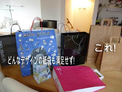 『プレゼントの包装など』嫁はプレゼントの『選択』と『プレゼントの包装』に超うるさい。オイラはサイフと相談しながらAでもBでも・・・Dでも選べばいいと思っているんだけど嫁はこの考え方に満足していないみたいだ。つまり嫁は自身が納得するまで何時間でもプレゼントをさがし続ける傾向にあるのだ。これは昔からの嫁の習性なので・・・しゃぁ~ないッス。笑今日はなぜか、プレゼントを入れる紙袋に嫁は執着していた。そのために、街中の各種カード、包装紙を売ってる店を何軒かまわっても彼女のイメージの紙袋が見つからず・・・オイラは早々にあきらめて・・・一人帰宅した・・・一時間ほどおくれて帰ってきた嫁は満足げに2個の紙袋をオイラに見せた。嫁はカラー模様、飾りのない袋をさがし各種カード、包装紙専門店ではそれが見つからず小さな小売店を一つ一つチェックして小さな雑貨店でこの無地の茶色い紙袋を見つけたそうな・・・笑『何か買えば袋はタダなんだけど・・・』と言いながら店のおっさんが渋々、袋をタダでくれたそうな。ははは・・・おっさんも呆れたのだろう。過去日記はCalendar.の日付をクリック!│