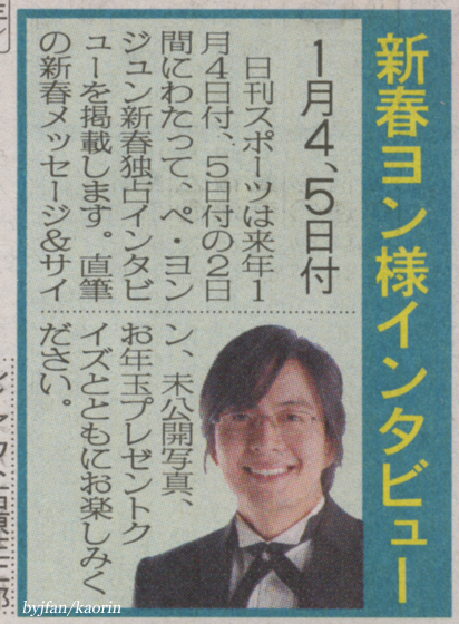 皆さん、如何お過ごしですか~?主婦は、お正月でもなかなかのんびり出来ませんね~。お正月は、ゆっくり韓ドラ三昧・・・夢見てましたが~残念!!日頃のつけか・・・やらなければならないことが多すぎ~食事の時間も食べたいものも主人と息子ばらばらで・・・主人と息子がヤギだったらよかった~と、思う私であります。。。ようやく、今日少しだけ、「イサン」が観れました。スッキリです。ペ・ヨンジュンがパク・ジニョンとコラボペ・ヨンジュン | パク・ジニョン 今年共に37歳になる同い年のトップスター、ペ・ヨンジュンとパク・ジニョンが事業で協力することになった。 韓流トップ俳優のペ・ヨンジュンと、歌手から世界的なプロデューサーへと飛躍したパク・ジニョンがエンターテインメント界でタッグを組めば、そのパワーは海外にも大きな影響を与えるだろう。これについて、JYP エンターテインメントの関係者は1日、「パク・ジニョンが代表を務める当社と、ペ・ヨンジュンさんが筆頭株主のコスダック(韓国店頭市場)上場企業キーイーストの共同事業という形になるだろう。まずはドラマなどの映像作品を製作することになると思う。韓国内でコンテンツを公開した後、海外で事業を展開していく」と話している。 さらに、「現在、具体的な方法や内容を協議しているところ。近く事業内容を発表する」とも語った。 ソ・ジュヨン記者スポーツ朝鮮/朝鮮日報日本語版 これこれ、この記事ず~っと気になってるんのですが・・・ヨンジュンssi何を計画中なんでしょ???4、5日紙面でヨン様独占インタビュー [30日11:52] 皆さん、明日は日刊スポーツ買いに走らないとね~。でも、慌てて転ばないでね~。(^_-)-☆私は、主人に・・・やっぱりヤギでなくて良かったカナ~? MBCヨンジュンssi動画fufu 私も、よく知りません。ハッハハ~ってきっと、ヨンジュンssiの方が知りたいはずやわ~知ってても、言えますかいな~・・・っていつの間にか、お笑いのノリになってもうた~ [Photo+Flash] Happy New Year*^^ 1 2 [Photo] 2009 年 1 月カレンダー*^^ [Vod]YTN+ETN~ETN*^^ [Vod]日本 TV (イサン) OST (Chang Yoon Jung) ...宜しければポチッとお願いします。m(__)m
