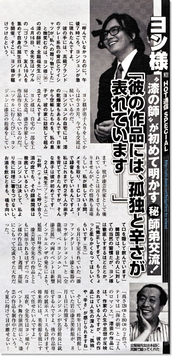 今日は、シトシト雨が降ったり止んだりの札幌です。 24日の日曜日、仲間達に誘われ札幌真駒内セキスイハイムで、行われる東方神起のコンサートに行くため・・・それまでに、韓国語の宿題終わらせなきゃ~と黙々とやっておりました。 チョン・ヨンボk, ペ・ヨンジュンの共同作品展科インタビュー↑ヨンジュンssiらしいですよね~。学びだしたヨンジュンssiより、長い間、苦労をしてきた方々もおいででしょう。ヨンジュンssiの謙虚さが好きです。でも、最近失われつつある、 伝統芸術ヨンジュンssiのこのことがあって皆、注目しだし 関心しだしたと思います。漆というものを多くの方に知ってもらえるチャンスですね。好い事だと 私は思います。そして、先生の言葉が・・・またいいですね~。「今のペ・ヨンジュンを見せなさい。」 そうそう、今のあなたが見たいの~!(^-^vプライベートは楽しんで、楽しんだ作品やPhotoなどを見せてくれたら・・・次回作までおとなしく待ってるわ~! So jisub カインとアベルOST ~ HowL 運命 ~