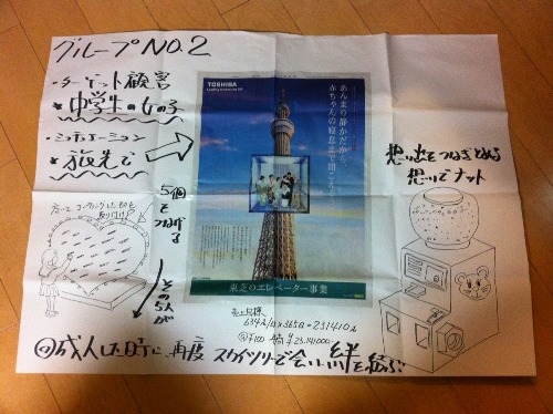先週末は、全国から約110名のものづくりの中小企業の経営者たちが、大阪に集う会合に参加しました。各地域のグループによる取組みのプレゼン、バラバラのグループになりその集まった企業の強みを活かして、お題を与えられ、事業計画を立てるというグループセッションをやりました。我々のグループは、ターゲットが女子中学生、シチュエーションが、旅先というお題を頂きました。わずかな時間ですが、写真のようなスカイツリーに、自分のメッセージを書き込まれた想い出ナットが1回100円で購入できる機械を考案、そのナットをスカイツリー横の川岸に設置されたボードにねじ込んで、一生の記念にするという企画です。なんだか実現可能ではないかと個人的には思っております。リラックスして、前向きに意見を出し合っていると不思議に実現可能なことにつながっていくものだと大いに感動をした次第です。リラックスをさせたのは、一人ひとりが少し長めの自己紹介をして、自分をさらけ出しているからではないでしょうか?社内で意見が出てこない、工夫していないとぶーぶーいっている私ですが、意見が出てこない環境を作ってしまっていることに今回気がつかされました。でも、本当に先週は、熱き仲間との出会いに大いに勇気づけられました。二次会は、ホテルでの部屋飲み!