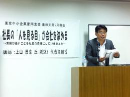 先日26日に東京中小企業家同友会 墨田支部の例会に参加しました。写真にもあるように社長の眼力が企業をいかようにも変えるといったお話を聞かせていただきました。講義後、、、、社長と社員間、管理者とその部下には、特に上の人が感じられない程のギャップが存在していることが、グループディスカッションで再認識されられました。まず、社長がよく下の者のことを聴く、聴きだす雰囲気づくりをする。うーん、この傾聴という姿勢は、絶対必要であることはわかってはいましたが、実行できていません。同じグループの方は、ある会社の部署のグループリーダーでしたが、「うちの社長は、言っていることを実行していない!」といわれていました。まさにオレのことか先ほども書きましたが、聴くことは、聴きだすということで、社員であれば何が彼の熱意を大きく動かすのかを知ることが大事なのです。京セラの稲盛名誉会長がいっている仕事の結果=能力×考え方×熱意ひとつでもマイナスであれば結果はマイナスになるのです。3要素をいかに社長は組織活性にむけて環境づくりをしなくてはいけないことを改めて知らされました。同じグループの社長は、社員を3つの層にわけて、社長ご自身みずから、私塾をもうけて、その塾を通して社員との対話を増やされているとのことでした。私も全体集会はかなり多く時間をつくるようにしてきましたが、自分自身の社員との対話は圧倒的に足りないと大いに反省させらました。