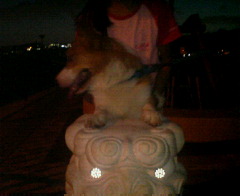 娘がバレーボールを始めてから、朝は一緒にジョギングしてます毎日じゃないけど・・・でも今朝は腰が痛くて、娘もバレーの練習で筋肉痛でジョギングではなく、ウォーキング・・・でもなくただの散歩になってしまった散歩と言えば、朝夕の散歩は息子二人がしてるんですが長男の帰宅が遅いので、今日の夕方のの散歩は次男と娘と私で・・・もう夜で暗くてよく見えませんが・・・ブルー(♂)をシーサーの上にのっけてみたら暴れてしまいましたシーサーの目が光ってる~いつもちゃんと散歩させてないのか疲れて道路にへばりついてしまったベリー(メス)散歩に行く時は、「おらおら~行くで~」といった勢いでぐいぐい引っ張るたち・・・。おかげで、また腰が・・・・