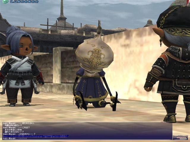 ヴァナ=インすると、ビシージレベル1です。ん~まだ時間あるなぁ・・・ってことで、ナシュモに行くことに・・・船を待つ間に倉庫キャラの荷物整理。戻ってくると、船が来てますΣ(゜Д゜;≡;゜д゜)ナシュモに行ったら、カダーバの浮沼へ~~からくり士クエのためです。カダーバからアラパゴ暗礁域へ行って、船の階段のところの???を調べて、「古びたからくり人形」を取ってきます。が、が、が、しかしなのです!!うちのPCアラパゴに入ると落ちちゃうんです( TДT)ノ~~で、やっぱり落ちて・・・・あわててPS2でインしなおして、船の???を調べて「古びたからくり人形」げっと。SS撮ったのに、送るの忘れた・・・・( TДT)呪符でもどってオートマトン工房へ~人形を直してもらって、タルタルに渡しにいくと・・・・それ僕のじゃない、君のだよ・・・(トカナントカ・・・・)で、からくり士ゲットです!!で、そのあとはミッションの続きで、ナジャ社長のところへ珍しく、ナジャ社長が敬語を使ってます・・・wで、これ・・・タルタルはほとんど見えてません( TДT)そんな最中にビシージのPTに誘われました。待つ間に用事を済ますことができて、よかったww今日のビシージは676ゲットデスw