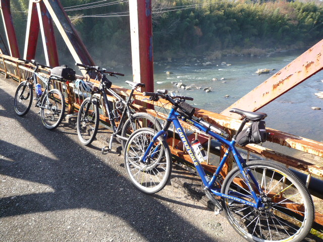 19日の日曜日にチームのメンバー2人と一緒にMTBで奈良県を旅してきました僕自身、関西方面はあまり走ったことがなく、今回はメンバーの百万馬力さんお勧めのルートです。名古屋を6時半発で近鉄の榛原(はいばら)駅まで輪行榛原駅前で輪行を解き、8時40分にスタート!冷え込みはありましたが、日中は暖かくなる予報で天気も良かったです南へ向かい国道370号を経て国道169号を走り、約2時間で道の駅「杉の湯川上」に到着。吉野川沿いの山あいを行く道の駅からは国道を逸れて、いよいよ山登りに入るのでここでエネルギー補給しました。百万馬力さんオススメの名物「柿の葉ずし」 旨い!左折して天川村方面へ向かうここからは林道なので、いきなり狭路になり勾配も12%前後となかなか手強かったですが、まだ皆さん元気で初心者のトラック野郎さんも順調に走っていました前進あるのみ!途中に2回休憩を入れ、約13kmのヒルクライムが頂上付近まで来ると、何だか道が危険な状況になってきました日陰は凍結!新雪の部分をソロッと走ります最後に積雪とかなりの勾配の所が現れ、上るために強めに右足・左足とペダルを回したら連続でタイヤが空転したので、慌ててペダルから靴を外し、もう歩きましたガードレール無いし、ヤバイっすよ!頂上付近にあった「大天井滝」は半分凍結していて見事でした!そして頂上から3kmほど下ると洞川(どろかわ)温泉に着き、昼食タイム20数軒の宿が並ぶ風情ある温泉街食堂に入り肉うどん大盛りで温まるしばしの休息の後、洞川温泉の先で県道48号に入り小南峠(標高1050m)を目指します杉林で暗い3kmの上り頂上でトンネルが現れる素掘りのトンネルと地図に書いてあり、どんな感じなのか興味を持って入ってみてビックリ!天井のゴツゴツ感もそうですが、50cmほどのつららがそこらじゅうにある!トンネルじゃなくて洞窟でしょ、これ百万馬力さんが選ぶ道はいつもマニアック!このトンネルを見て本人が大喜びしていたのは言うまでもありません(笑)トンネルを抜けたら吉野方面の展望が開けました峠を下り県道257号を経由して桜で有名な吉野に着き、当然今は桜の時期ではないので世界遺産を巡りました。日没が近づき吉野からの輪行時間も気になるとこですが、せっかくだから少し離れた所にある水分(みくまり)神社も見ていこうということになり、何気なく向かったのですがとんでもない激坂が待ち受けていました!約1.4kmの行程で平均勾配13.8%!これは百万馬力さんのトラップか!?今日はフロントギヤをアウター(重い方)のみで走り切ると決めていたので、全てダンシング(立ちこぎ)で走る!それでも重力に負けて自転車が止まりそうになる時があり、坂と格闘していたら心拍が限界に達してしまい、足を2回着いてしまいました世界遺産「金峯山寺」激坂のつづら折れちょっとこれは凄すぎました後は近鉄の吉野駅まで下り、本日の任務完了となりましたいつものように帰りの車内で輪行ビールを頂き、今日の話しに花が咲くのでした吉野は初めてだったので来れて良かったです。今回のルートを基に序々に奈良県も制覇していきたいですね。今日の走行 距離:106.06km 平均速度:17.2km/h 最高速:63.1km/h 平均心拍数:109/min 消費cal:2966 獲得標高:1734m