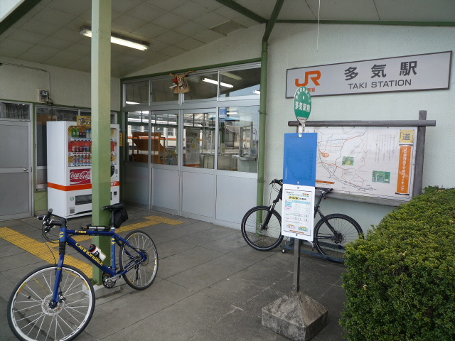今日は百万馬力さんと三重県の多気駅まで輪行して、そこから山の中を走って津駅まで行くルートをMTBで探検してきました!輪行中の車内で雪が降っているのが見えて不安がよぎる。多気駅へ降りてみれば真冬の寒さと強風!ハイ、今日はやめ!って思いたくなるぐらい気分は下降しました輪行を解く作業で指がかじかんだ。何とか気合を入れて9時半にレッツゴー!日差しはあるものの走り始めて10分ほどで小雨がパラつく…これから向かう先の空は雲がかかり、遮るものがない田園の中では向かい風により時速15km程度。こ、これは修業か!?多気駅から西の方角へ自転車を進め、国道368号で仁柿峠(標高430m)を越えて身体に熱を入れていきます今回MTBを改造してきまして、上りがかなり軽快になりました百万馬力さんには、反則的だと言われましたが、その辺の改造内容はまたブログで紹介することにします。峠に近くなるといい雰囲気になってきました杉林が向かい風を遮ってくれます途中に景色が開ける場所があり、気持ち良かった仁柿峠の頂上に着いたら雪が降ってきたので、冷える前にさっさと下って道の駅「美杉」に寄り暖をとりました。小腹も空いたので暖かい物をと思い「三重と言えば伊勢うどんだろ~」と考え注文したのですが、汁が少ないのをすっかり忘れており温まりきらず、普通のうどんを食べている百万馬力さんが羨ましかったですでも、美味しくいただきましたここから国道368号を更に西へ向かい、JR名松線の伊勢奥津駅を過ぎたら全く案内看板などない通り過ぎてしまいそうな路地を北へ入って、本格的な怪しい(楽しい??)道の始まりです。県道667号。地図を見ても峠の名前すら載っていませんが、平均勾配11%の坂が3km続く変態入ってる道で、1番キツイ所では時速5kmも出れば十分!蛇行気味になりながら上っていきました。何年かぶりにフロントギヤも3枚目のインナーを使用して、1回降りると自転車にもう乗れなくなりそうだったので写真も撮れませんでした~頂上付近でもだえる百万馬力さん!この先から県道755号へ入り山の中を延々と走って、桜峠・布引峠・青山峠と越えていきましたとにかくどこまで行っても同じような荒れた杉林の道で、同じ場所をぐるぐる回っているような錯覚に陥ります。延々と続く杉林の県道755号布引峠に「メナード青山リゾート」という所があり、そこの蕎麦屋で炭水化物を補給今日の行程の約半分の場所なのですが、もう2時半!県道の分岐が結構複雑で、地図を見て確認しないと不安な箇所がいくつもあって時間が掛かってしまいました。どっちに行っていいか分からん、泣き別れの道桜峠(標高580m)は頂上で交差点になっている変わった道そして本日の目的地「青山高原」へ向かう勾配7.7%が3km続く坂道を攻める頃には夕方5時を回っていて、標高700mを越えるこの場所は急激に寒くなってきていました最後の力を振り絞る!展望台からの景色は素晴らしい!伊勢湾まで見えました~強風で風車もブンブン回っておりまーすこれで上りは全て終了!あとは極楽の下り坂…、になるはずだったけど、日が落ちて更に冷え込み序々に体温が奪われ指先が痛くなってきた道路なんて凍結している所もあったし、道路脇の草むらも雪化粧!冬用のグローブを着用していたのですが、全くダメで坂の中盤からブレーキを握る感覚が怪しくなってきたあまりの痛さに1回休憩を入れたほどで、まさに地獄のダウンヒル!!1日頑張ったご褒美がこれとは…ガックシ!汗もあまりかかなかったので温泉は入らずに帰る予定だったのですが、入らないと凍え死にそうなほど冷え切ったので榊原温泉に直行しました!もう、早くお湯に浸かりたい!浸かりたい!という気持ちとは逆に指先が全く機能せず、自転車に鍵は掛けれないわ、入浴料も財布からうまくだせないわで大変でした。やっと風呂場に入ってお湯を触れば、身体が冷え切っているのでどの浴槽も激熱に感じられ、浸かりたいのに浸かれず2人で大騒ぎ!(笑)慣れてこれば普通の温度でしたは~、榊原温泉はぬめりがあり肌はすべすべで最高~。極楽極楽…そして風呂から出て、輪行の時間を調べたら最終「快速みえ」の時間が迫っているではないか!湯上りにホッとする暇もなく津駅までぶっ飛ばし8時7分発に間に合いました!ふぅ~今日は日帰りで行ける輪行ツーリングの限界に挑戦したような旅でした。もう少し暖かければもっと楽しめたかなと思いますが、こんな厳しい体験の方が後から思い出すと楽しいんですよね!今日の走行 距離:129.16km 平均時速:18.1km/h 最高速:55.8km/h 獲得標高:2228m