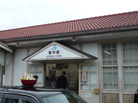 香川県の琴平駅にやってきました。ハルさんと男2人旅です。そして、今にも降り出しそうな空模様。予報通りとはいえ、やっぱり雨は気持ちが下がるな~。さすが!タクシーの屋根にもうどんが!自宅から名古屋まで自走して、早朝の新幹線に乗って岡山で特急に乗り換えて、琴平に着いたのが10時前。ここから走り始めるけど、せっかく来たからこんぴら参りでもと思いながら輪行バッグから自転車を取り出して、準備してたら早くもポツポツと雨が・・(>_