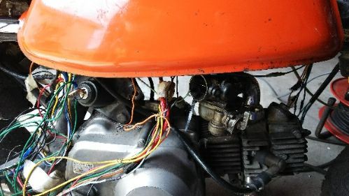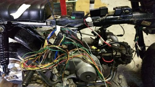 モンキーテール回りもできてきて、あとはカブの配線をきれいにまとめないといけません😥 カブのエンジンとハーネスを移植すると決めたからには通らなけらば行けない道じゃ‼️😧 カフェレーサースタイルはやっぱりスカチューン‼️😊 スカチューンってことは配線をなるべく見えないようにしなければいかん‼️😬 たしかに、カブの方がフレームは大きいし、その分ハーネスも長くなるのは当然なのだが…😧 でもこの配線の束を見るとやる気がうせるなぁ…😧 そこで…【今日は右のウィンカー関係の配線だけ処理しよう‼️】と小さな目標を持って取り組むことにしました😊 これは仮組みのときの写真ですが…何にも手をつけて無かったので、配線を短く切ったり、半だ付けしたり、ギボシを作ったりとほんとに、時間ばっかり過ぎて行きました‼️ でもあとあとの作業のことも考えて、部分的にオスメスのギボシを使いながら…😧 そして、約1週間かけて配線処理完了‼️😊 これだけの配線がいらなくなりましたよ😃 ホンダ純正12VモンキーハーネスケーブルCタイプNO3025