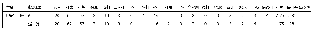 阪神在籍 : 1年 20試合57打数10安打2打点1本塁打5四死球4三振0盗塁 打率.175
