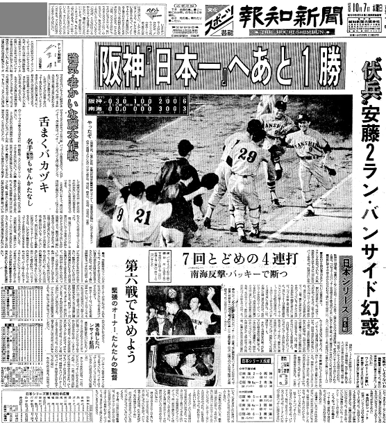 6-3と追い上げられた阪神は渡辺省三からバッキーとつないで逃げ切ってバーンサイドに白星がつく。この勝利で3勝2敗とした阪神が日本一へ王手をかけたわけだ。