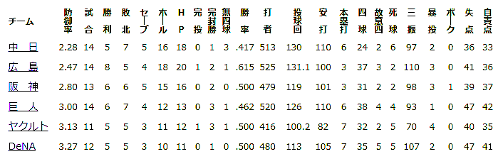 貯金があるのは首位カープだけで3つなのよね ほかのチームは貯金がなく3球団が5割 最下位の中日も借金は2つだから どのチームも抜け出していけそうな気配がない足踏み状態って感じになってるかな