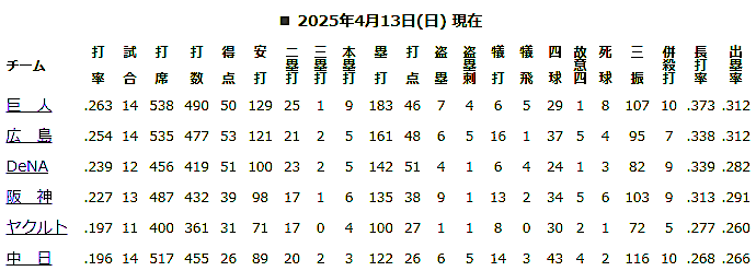 各チームの攻撃陣は ジャイアンツのチーム打率が好いんだけど開幕から数試合好調だったころが反映されてるだけで今は落ちてきてる
