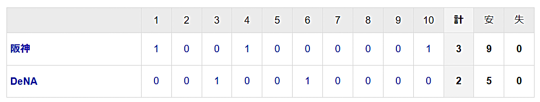 DeNA 2-3阪神 5回戦延長10回 阪神2勝2敗1分(横浜スタジアム)