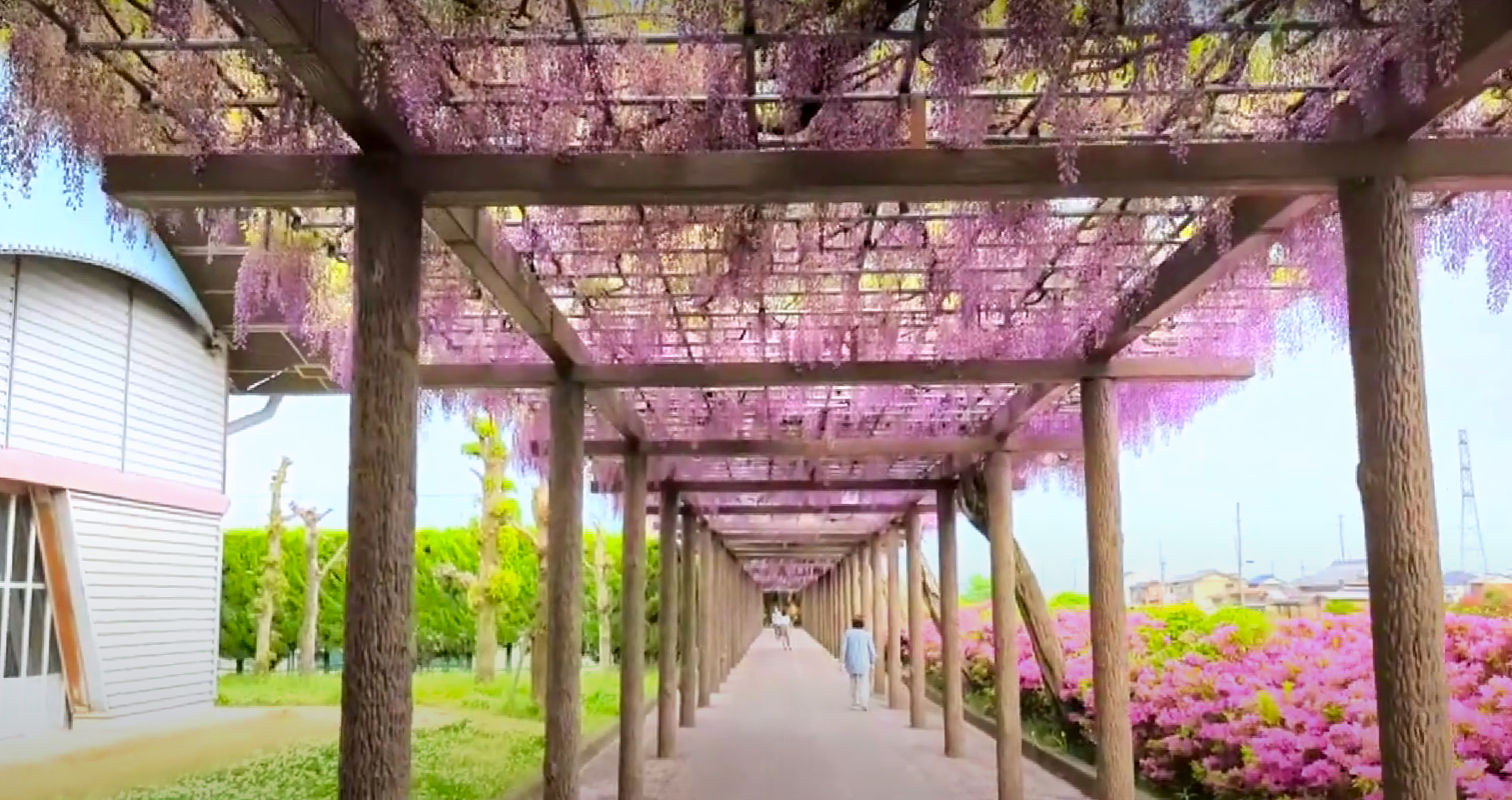 サッカーコートが2面とれる多目的グラウンドの外側をぐるりと一周できる回廊がみんな藤棚になってるんだよね とりあえず4月25日に写真撮ってきたので観てください!