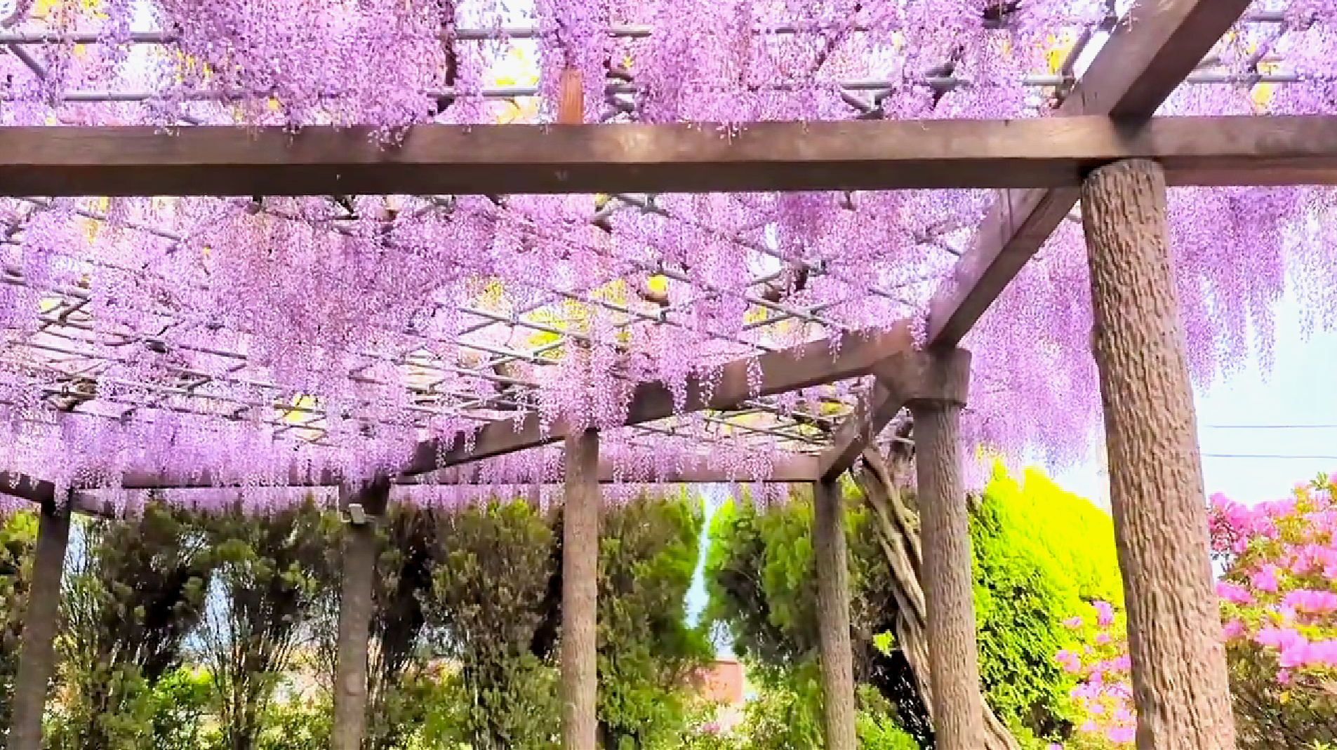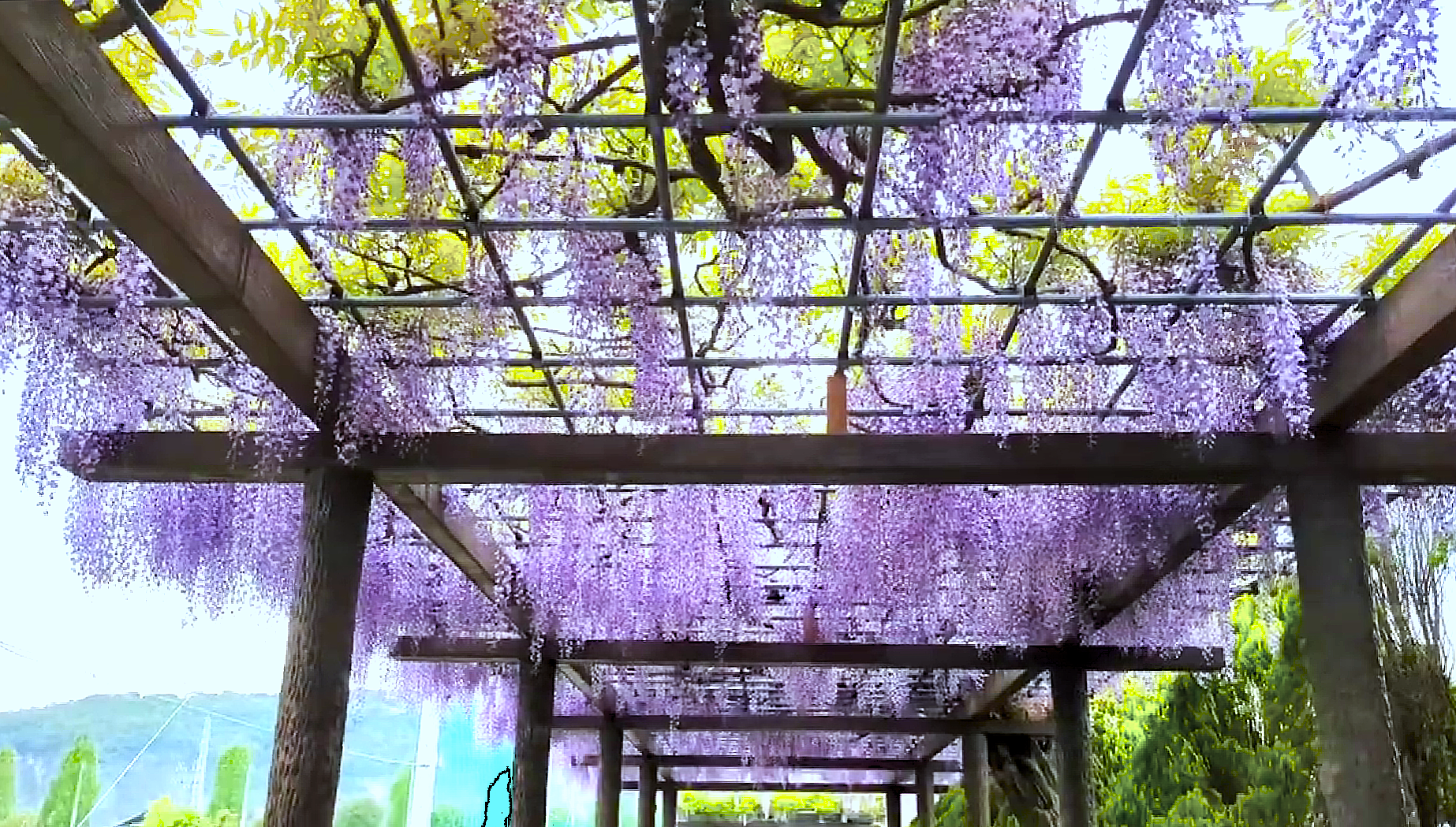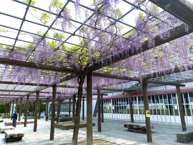 ゴールデンウィークに入ると 地元では毎年5月3日に「藤まつり」が開かれます スポーツ公園の回廊が藤棚になってて藤の花のトンネルをくぐれるよ すごく綺麗なんだ!