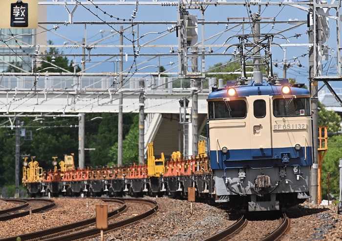 EF65-1132 工8380レ 向日町FB溶接工臨 2025.07.20(日) 須賀神社前上 Z8 AFS70-200mm/f2.8下 Z9 z24-120mm/f4S現地入りすると誰もいません。 やってしもた・・・、と不安な気分で待機でした。無事にやってきた列車はレール3段積みで迫力ありました。