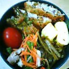 学校が終わってから、娘の塾があります。時間がぎりぎりなので、すぐに下校してくるように。と、朝、釘をさして置いたにも関わらず、授業が終わって30分を過ぎても出て来ません。教室を覗いてみると誰もいません。まさか、と、思いつつ 図書室を覗くと、そこにランドセルを背負った娘が席に着いて本を読んでいました…。「どうして?あれほど言ったのに!」「いやぁ~。そのぉ~。あっ塾の宿題がまだ終わってなかった…」「なにぃ~それならなおさら、早く帰って宿題をやらなきゃなら無いでしょ! 分かっていながら、のんびり本を読んでたの?」「だってぇ~」「何が、だってよ!」「忘れたぁ~」最後の一言に、ぶち切れました。家に着くまで、会話 なし。私は、本当に怒ると 無言になります。すぐに着替えて、塾まで送り届け、私 「やってない宿題は、塾が始まる前に やりなさい。」娘 「はい…」娘は塾が終わって、家に着いたら、私に言われないうちに学校の宿題と、塾の宿題を黙々とやっていました。夫の弁当…黒米雑穀玄米ご飯、鮭の竜田揚げ、椎茸の鶏団子詰め、海苔巻き卵焼き、きんぴらごぼう、もやしのカレー風味サラダ、プチトマト、味噌汁。