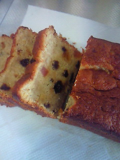 今日は、ドライフルーツ&オレンジピール入りのバナナケーキを焼きました。 昼食の後、珈琲と一緒に一切れ。o(=^○^=)o アーン♪ 美味しかったです。