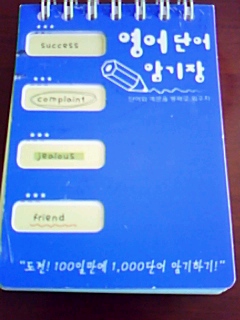 学歴社会の韓国だからのかな?スーパーや本屋の文房具売り場をのぞいてみてみてかなり充実してますよノート売り場が楽しくて~~それに安いのでいろいろ買いたくなるのですが。。。気を抜いたら荷物がすぐに重くなっちゃうので注意日本でもありそうでなさそうな?語学を勉強してる人にとってはとっても便利に使えそう買って愛用している「単語帳」を今回はご紹介しますまずはこちら「英語単語暗記帳~挑戦!100日で1000単語暗記すること!」って書いてあります。。これ確か2000w(今のレートでは160円位)だったと思います。手のひらを広げた位のサイズでこの中に1000語書くことが出来る。。中身はこんな感じ1つの単語に対して枠が多いので~意味も例文とかも書けちゃいますそしてこの単語帳の優れものなところはブルーの表紙だけしっかりナイロンで分厚くなってて簡単に取り外しが出来るんです覚えたいページに外したブルーの表紙を挟んでそのページの暗記勉強ができますなかなかでしょけれど持ち運びにはちょっと重いですそこでもう1つの優れもの名詞サイズ程の大きさの~こちらも英語単語帳面。。1つ1000w(80円位)左側に単語を~右側に意味を。意味欄も2段あるので例文位なら書けます中身はこんな感じこの単語帳の優れたところ表紙カバーの右を倒せば~単語を見ながら意味を考えられる。 左を倒せば~意味を見ながら単語を考えられる。小さくて持ち運びにも便利ですよ日本で単語帳といえば~1語ずつめくっていくのしか見たことなかったんですがこのMADE IN KOREAの単語帳韓国の学生さん達は英単語のために使っているようですが。。。どんな語学の勉強にも使えるんじゃないかと思います最初に紹介したブルーの方は、龍山駅のEマートの文具売り場で見つけて、他に赤色もありました。。それから他の場所では見かけてないんですけど。。。小さい方のは、大きめの本屋に隣接してある文具コーナーとかスーパーの文具コーナーにあると思います。私は乙支路入口の3,4番出口の地下から入ったところにある本屋さんの文具コーナーで買いました。。語学を勉強しているお友達や学生さんへのお土産に~こんな優れもの単語帳はいかがでしょうか