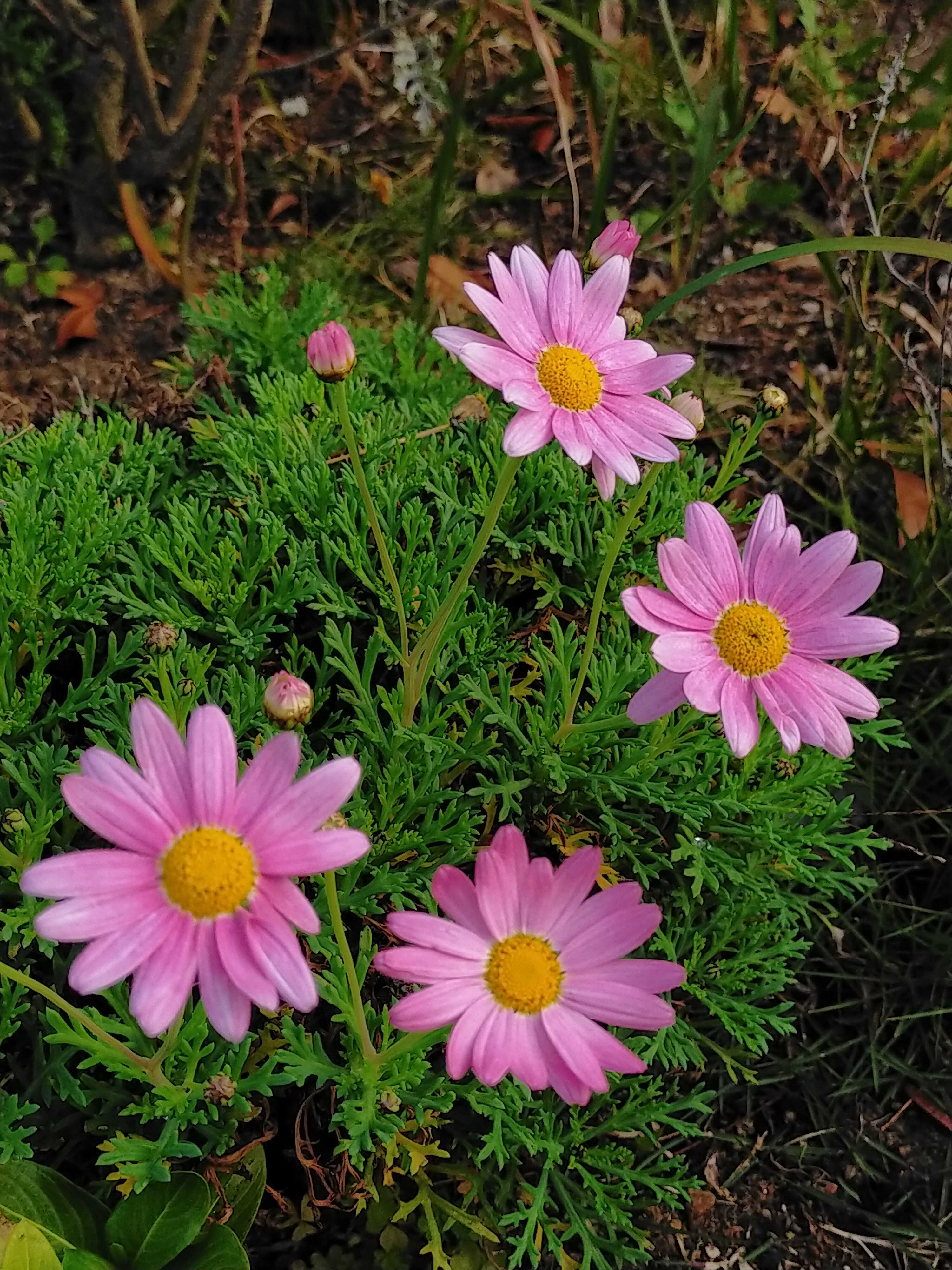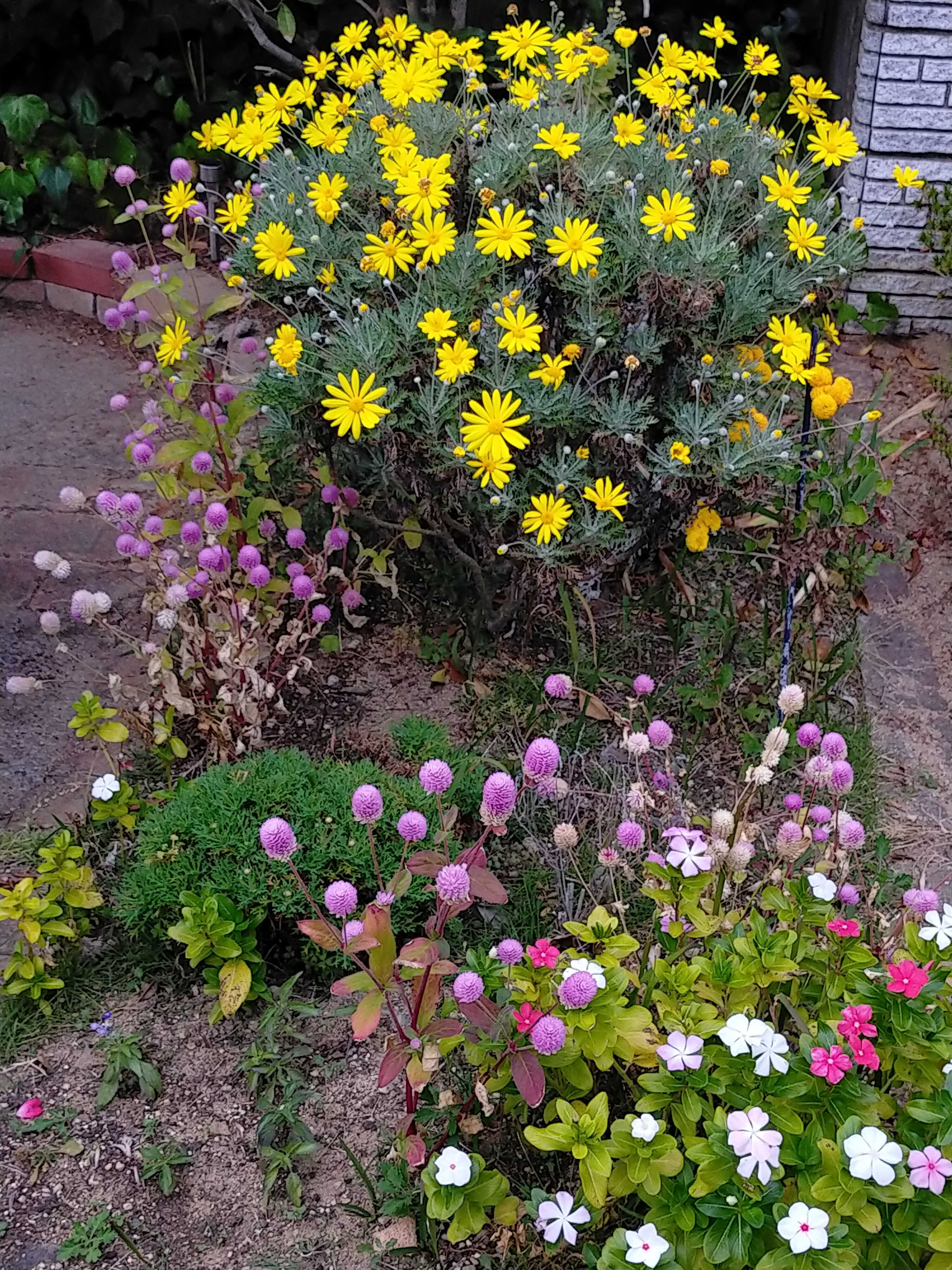 バラを中心に栽培していました。バラ園の世話をしている業者の方が庭を見てやろうと来てくれました。するとバラの根本の草花を全部取っていきます。根本に日が当たるようにしなければいけないのだそうです。そうしなければ、根本から出るベーサルシュートがでないのだそうです。そういえば大きなバラ園では根本にほかの草花は植えてありませんね!そう思ってたところバラの芽接ぎやら剪定やら教わった先生のうちの庭、毎年オープンガーデンをしてますが根本はいろんな草花で覆われています。去年から私もいろんな草花植えることにしました。ところで今年終わったなと思ってると次の年芽を出してくる草花がたくさんありますね。現在、うちの宿根草を含んだ草花たちです。ユリオプスデージーが長いこと葉だけ茂らせていましたが今花盛りです!日日草はこぼれ種から目を出して今年新たに植えたものより繁っています。1年目より2年目、3年目のほうが立派になりますね!去年ペンタスを植えました。枯れてしまったと思っていたら今年芽をつけきれいに咲いています!秋バラ、チャールストンの4日目満開になっています!