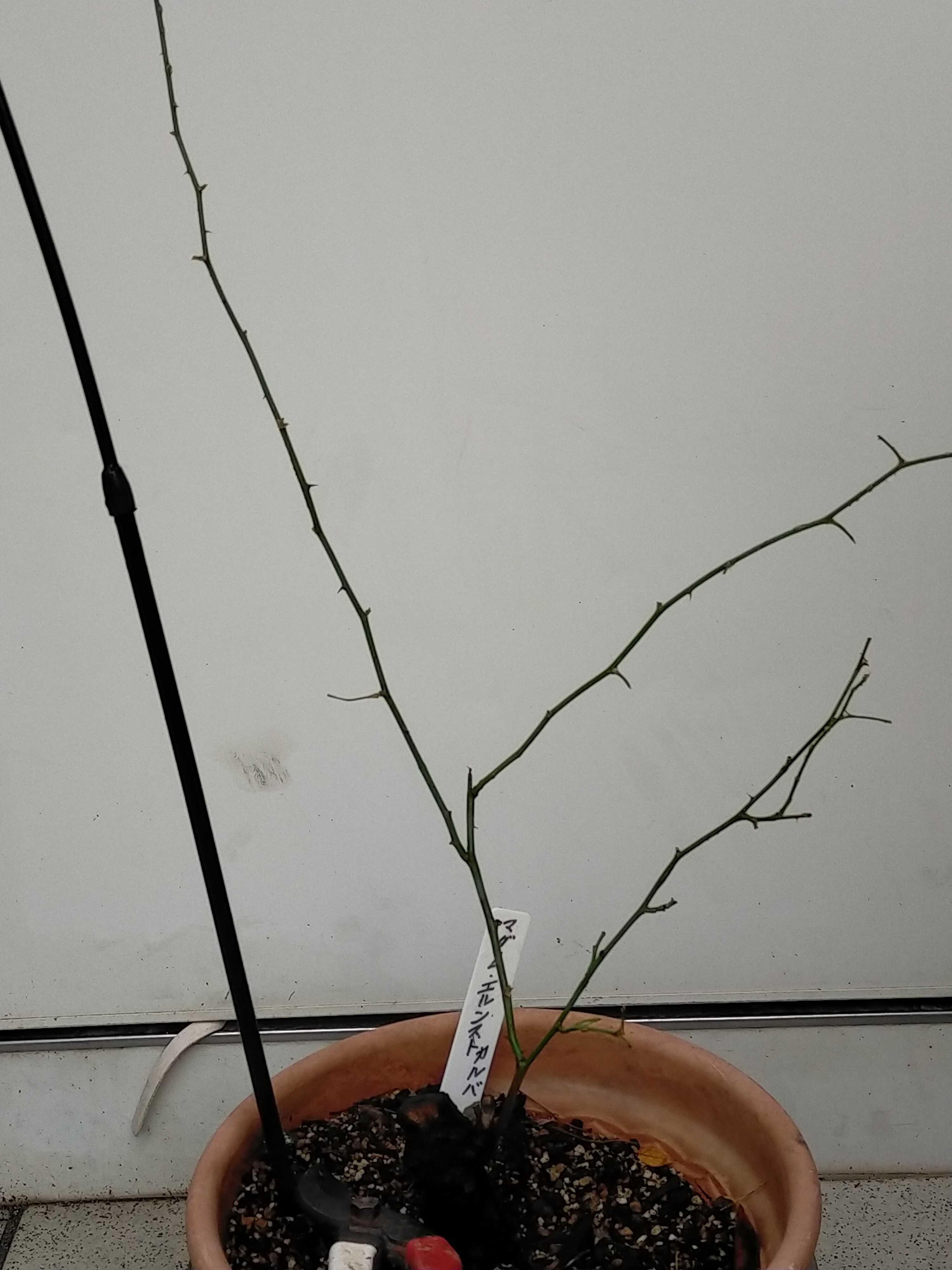 今日は比較的暖かったですね。時々雲の合間から太陽が見えていました。ようやくバラの剪定とつるバラの誘引が終わりました。10年ぶりの寒波がやってくるそうだからなんとか終わって良かった!まだ刈り込んだ枝の挿し木が残っています。マダムエルンストカルバというオールド・ローズがあります。2メーターぐらいの高さの支柱に香りのいいバラでしたが数年前、テッポウムシにやられて倒れてしまいました。幸い挿し木していたのですが、うちの奥さんがうちで一番日当たりの悪いデッドスペースに地植えしていました。それを掘り上げて鉢植えしたのですがその時長い根も切ってしまい去年一年細々と生きています。つるバラだから60センチほどに伸びているのですが枝の太さが2,3ミリぐらいしかありません。その写真です!やはり挿し木苗は成長が弱いですね。今年は植え替えて施肥も十分にして肥培するつもりです。庭のベランダのテーブルの上にミカンを置いています。メジロが必ず2羽でやってきてついばんでいます。番だろうか?去年と同じメジロだろうか?