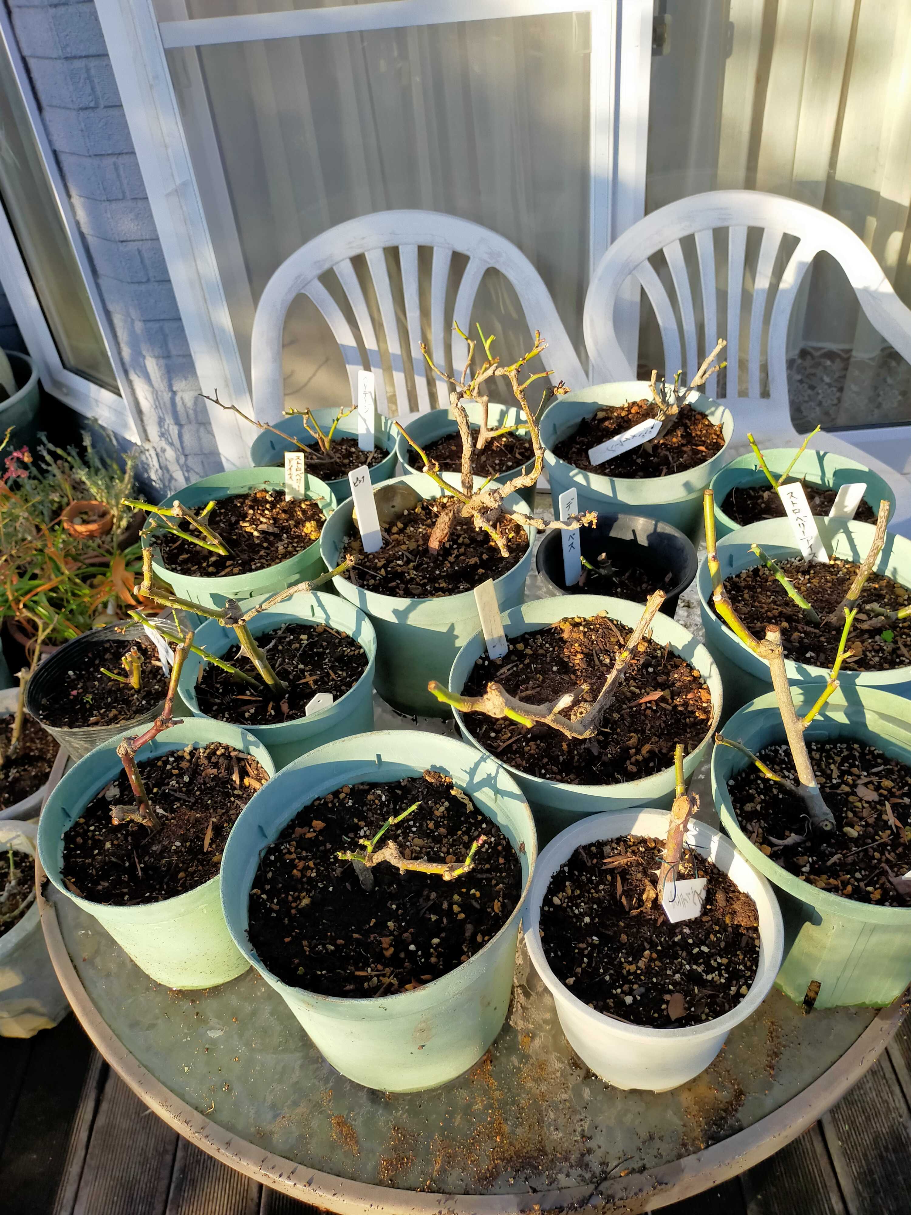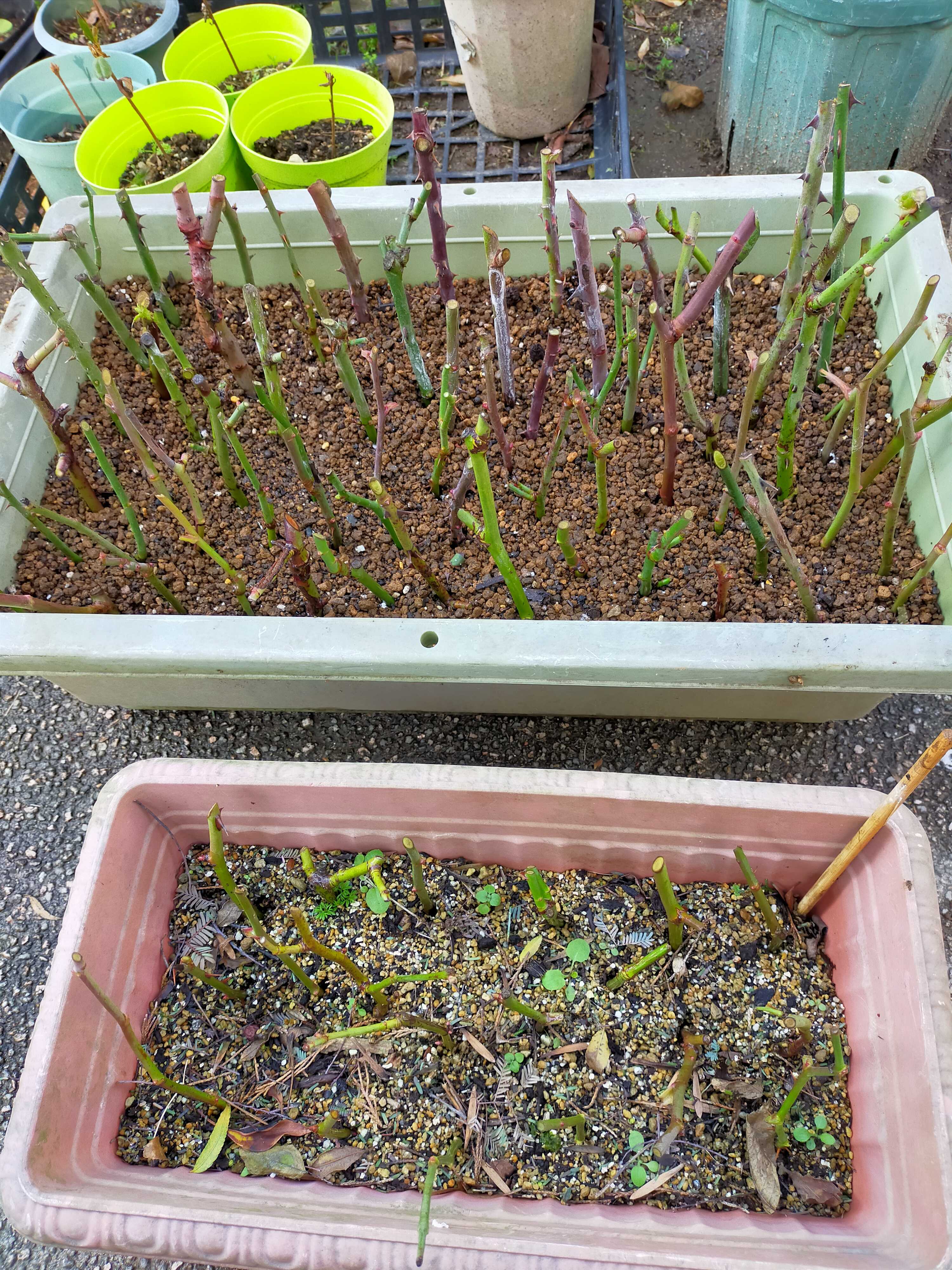 久しぶりにお日様が一日中出ていましたね。今日を逃すと寒い日が続くと頑張って庭仕事やりましたその1挿し木冬剪定した枝をバケツの水のなかにつけていました。それを発根剤のルートンをつけて差しました。70本ぐらいあります。ただ挿すだけなのにけっこう時間かかりました。その2去年からほっておいた一年経った挿し木骨粉入り油かすと牛糞堆肥を混ぜ込んだ土に植え替え20鉢ぐらいありました。その3種から育った矢車菊を公園擁壁に植える20ぐらいあります。かなり頑張りました!